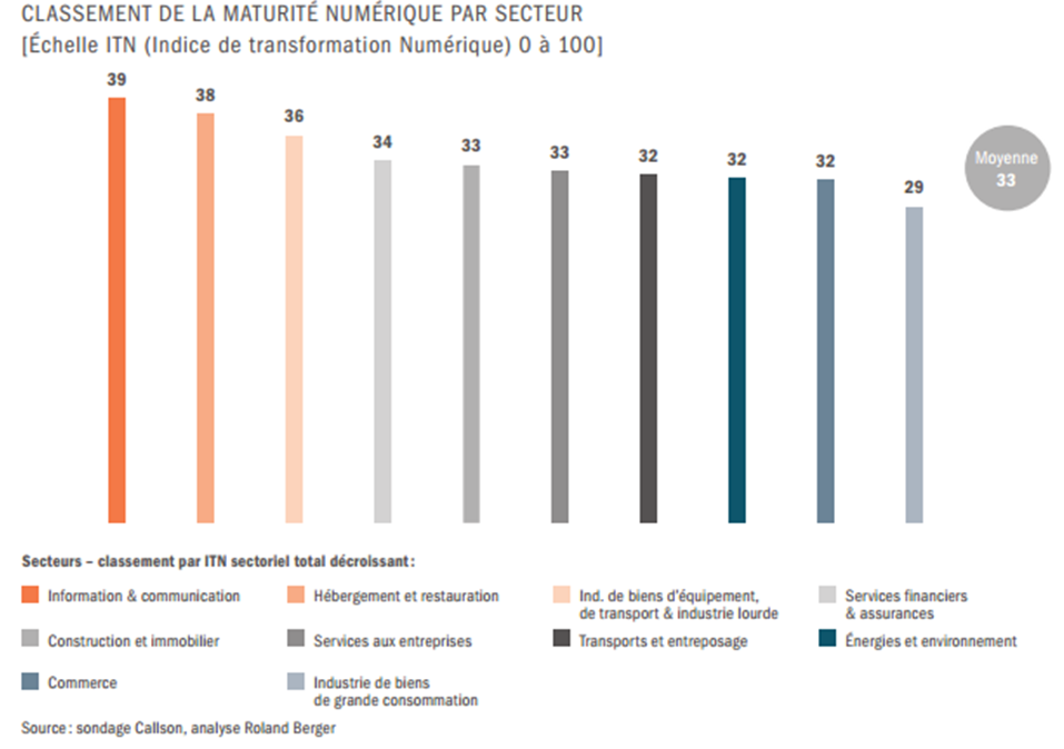 Notons que tous les secteurs de l’économie ne connaissent pas une maturité homogène. Si les entreprises de l’information et de la communication sont chefs de file en France, l’industrie de biens de grande consommation est en bas du classement. Enfin, les grandes entreprises sont en moyenne plus engagées dans la transformation que les autres.