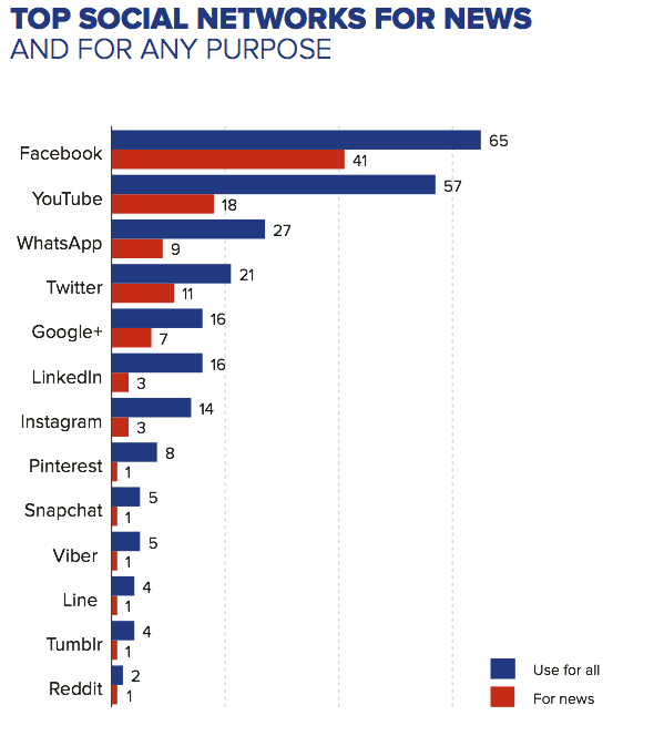 Si les médias sociaux deviennent des sources d’information de plus en plus importantes au cours des quatre dernières années, tous ne deviennent pas référents en matière de news et d’audience. Facebook est de loin le réseau social le plus populaire pour la consommation d’information, profitant de plus en plus du public de son plus proche rival, YouTube. 41% des répondants ont déclaré utiliser Facebook pour trouver, lire, regarder, partager, ou commenter les informations chaque semaine. La popularité de Twitter parmi les médias sociaux ne se reflète pas dans les habitudes d’utilisation du panel : seulement 11% d’entre eux déclarent utiliser ce réseau de partage. Toutefois comme le rapport l’indique, les chiffres ne démontrent pas les différentes façons dont les utilisateurs exploitent ces réseaux.