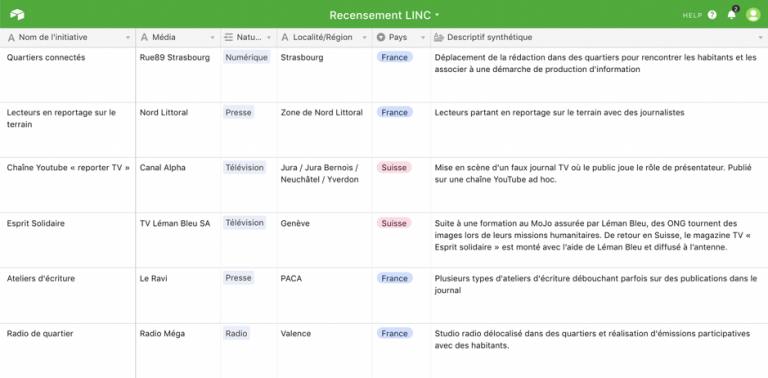 En vue d’analyser les actions, stratégies et pratiques des médias locaux en termes de lien avec les publics, la première tâche consiste à repérer la matière à étudier. Dans la logique coopérative et applicative du projet, nous avons opté pour un recensement participatif, conjugué à la mise à disposition d’une partie des données récoltées sous licence Creative Commons. Un formulaire en ligne permet ainsi à toute personne (professionnel de média, chercheur, expert ou même citoyen ordinaire) de faire connaître une initiative (action, dispositif, événement, etc.) d’un média français, wallon ou suisse romand, visant à (re)penser le lien aux publics. Les initiatives ne sont retenues que si elles sont portées par des médias dont on peut considérer qu’ils sont locaux dans une acception large (en somme: produisant de l’information sur et pour un territoire plus petit que le territoire national) et employant au moins un-e journaliste professionnel-le. En plus de cette approche par crowdsourcing, l’équipe elle-même contribue à la base de données et effectue un travail de vérification et d’édition des entrées proposées. Fin juin 2019, près de 250 initiatives ont ainsi été répertoriées; une liste qui a vocation à s’agrandir encore…