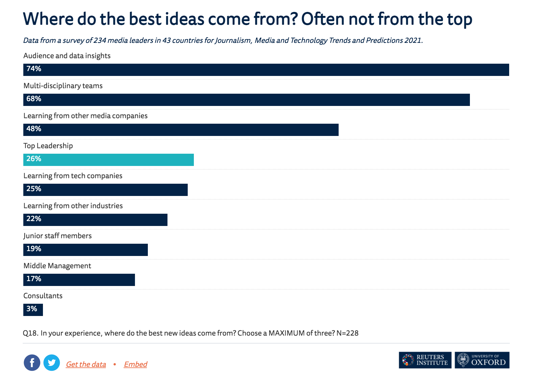 La création d’une culture plus innovante reste une préoccupation essentielle pour de nombreux leaders du numérique. Mais il s’avère que les meilleures idées ne viennent pas toujours du haut. Selon l’enquête, la connaissance du public et des données (74 %), les équipes pluridisciplinaires (68 %) et l’apprentissage auprès d’autres rédactions (48 %) sont considérés comme les meilleurs moyens de générer de nouvelles idées, contre seulement 26 % venant du top leadership.