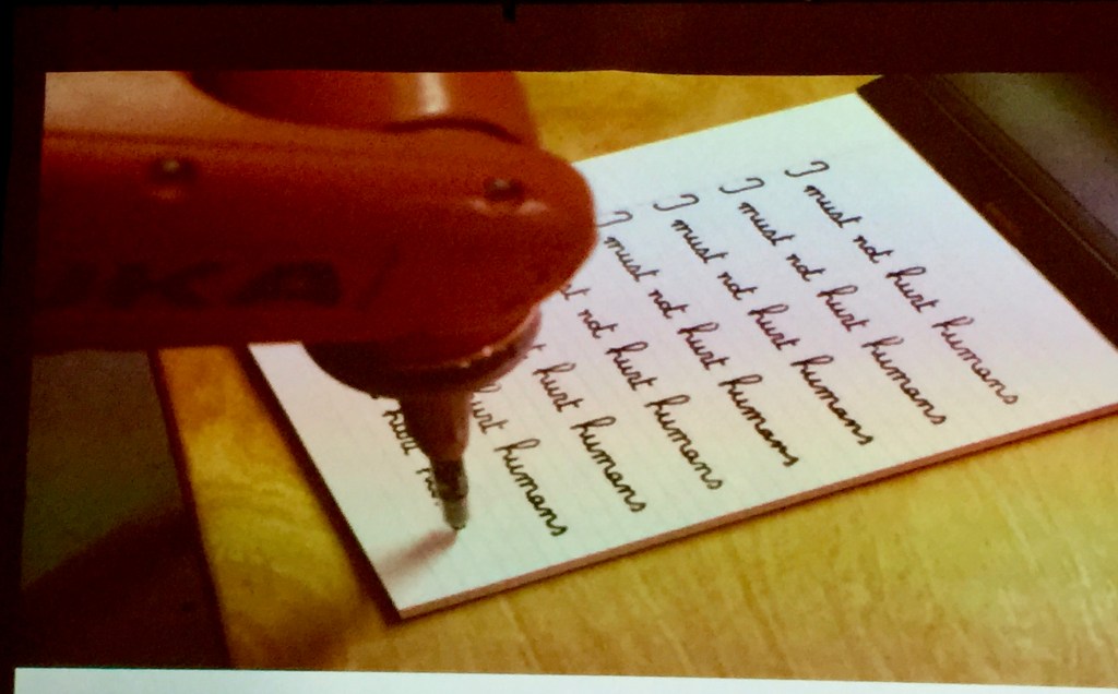 En entrant dans la Grande Halle de la Villette, on le voyait ce week-end, isolé dans son coin mal éclairé, courbé sur sa punition. Ligne après ligne, le robot recopiait, toute la journée, la leçon d’Asimov à, surtout, ne jamais oublier : « I must not hurt humans » (Je ne dois pas m’attaquer aux humains*). Clin d’oeil, […]